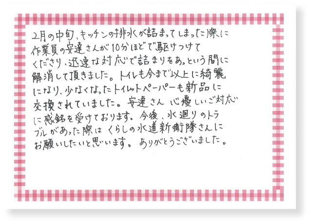 最短10分程度でお伺いできます。 ただ、移動距離などによってお時間は変わりますので、お電話を頂いたときにお客様宅への到着時間をお伝えさせて頂いてます。